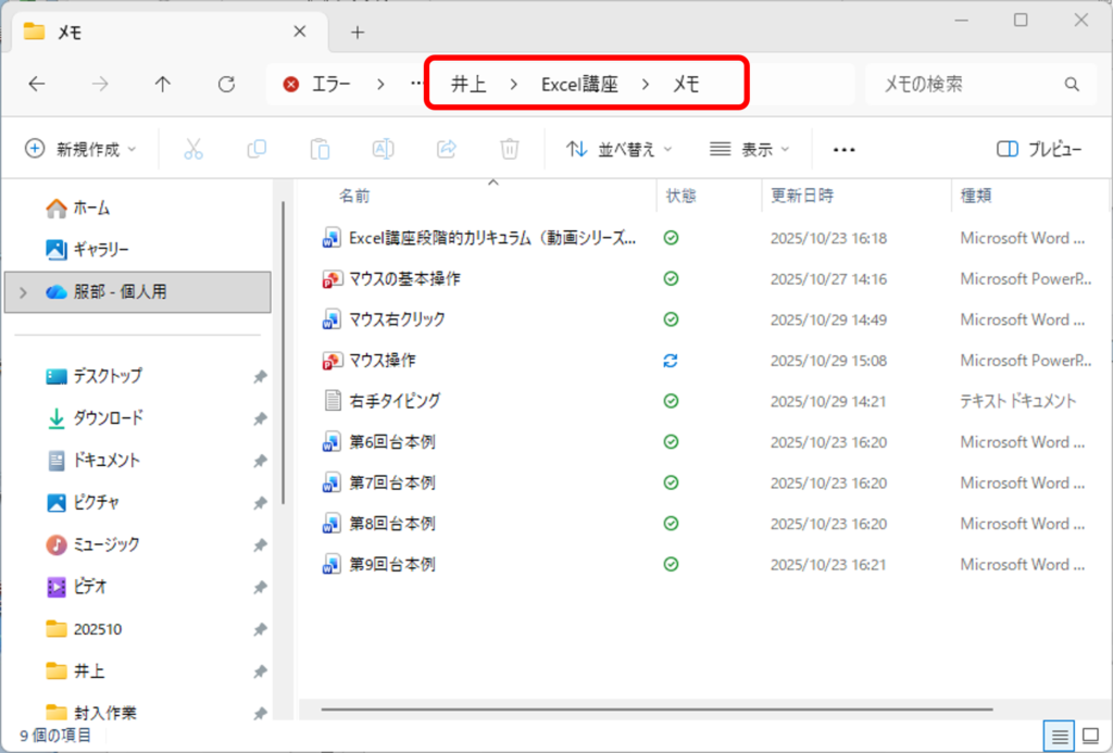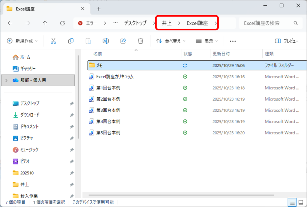 「Excel講座」というフォルダの中に、「メモ」というフォルダが入っています。