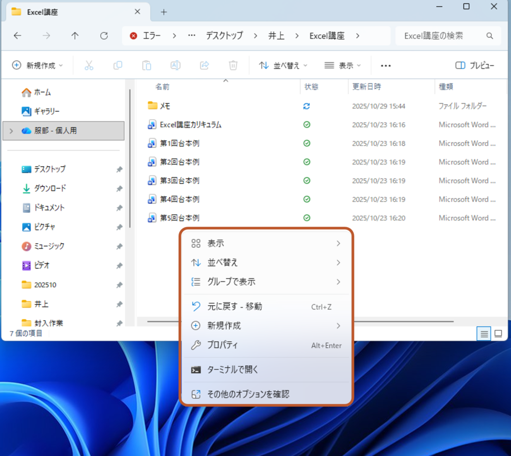 エクスプローラーで「Excel講座」フォルダを開いた状態。