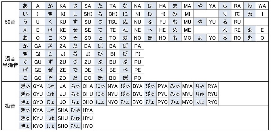 上の表は、ヘボン式ローマ字表です。